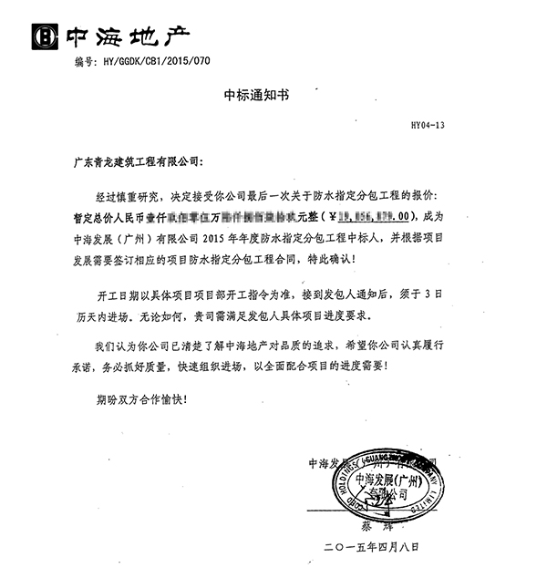 青龍集團(tuán)中標(biāo)中海地產(chǎn)廣州防水項(xiàng)目通知書
