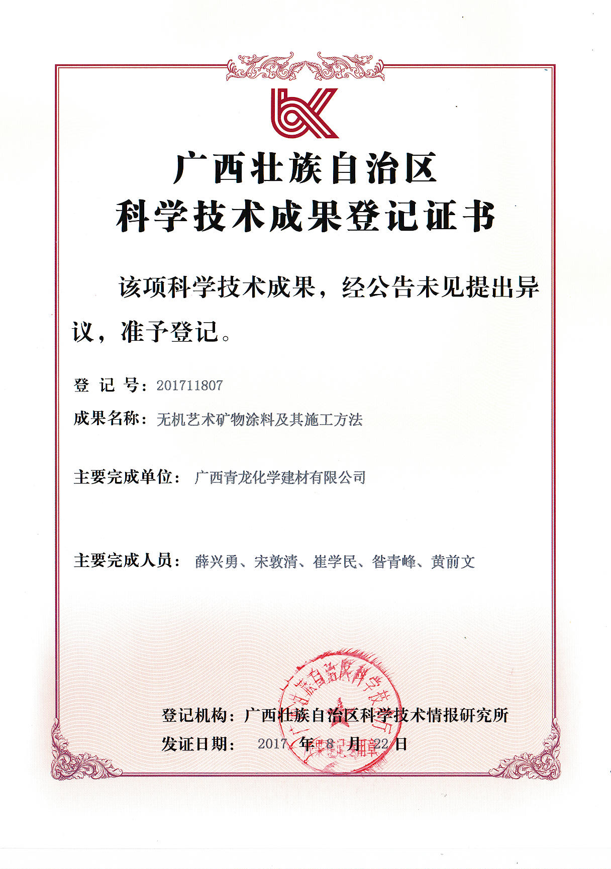 無機藝術(shù)礦物涂料及其施工方法科技證書