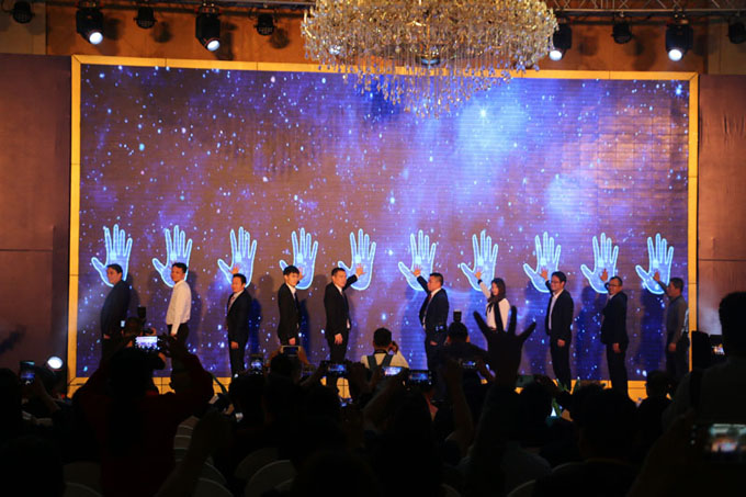 ▲宋敦清董事長(zhǎng)等十位嘉賓在液晶大屏上按下手印,正式啟動(dòng)狂歡節(jié)。