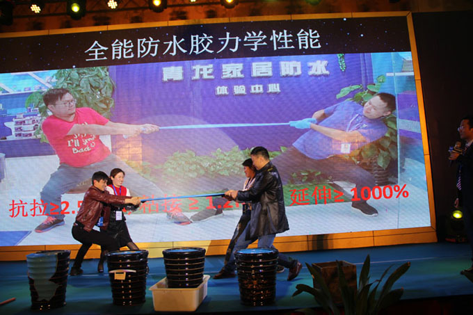 ▲新品發(fā)布會(huì)上,青龍防水薛興勇博士發(fā)布了青龍公司全能防水膠、粘彈防水密封膠、家居防水專用卷材、砼1號(hào)、砼2號(hào)五款新產(chǎn)品,并現(xiàn)場(chǎng)邀請(qǐng)觀眾進(jìn)行產(chǎn)品性能試驗(yàn)。