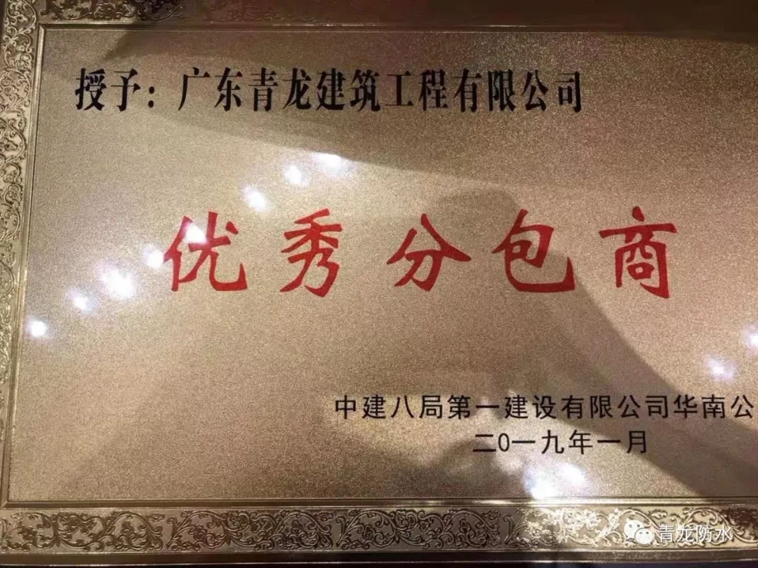 2019年1月,在中建八局第一建設(shè)有限公司華南公司2018年度優(yōu)秀分包商座談會上,我司喜獲"優(yōu)秀分包商"獎項,高度彰顯了青龍公司卓越的技術(shù)實力以及優(yōu)質(zhì)的服務(wù)能力。