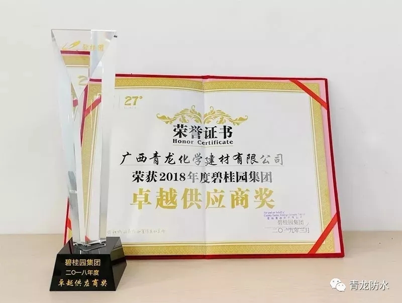 2019年3月7日下午,正值首屆"建筑防水工技能實操大賽"鏖戰(zhàn)正酣,在碧桂園集團(tuán)2018年度供應(yīng)商大會上,青龍公司憑借過硬的產(chǎn)品質(zhì)量和良好的企業(yè)服務(wù)體系,喜獲2018年度"卓越供應(yīng)商獎"稱號。