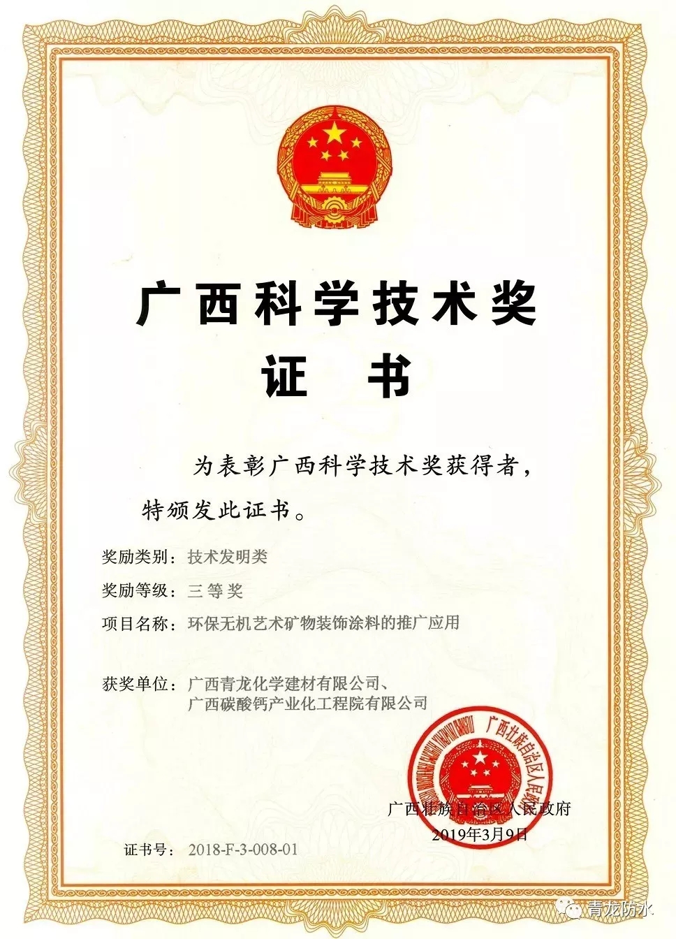 4月9日在廣西科學(xué)技術(shù)獎勵大會上,青龍公司榮獲2018 年度獲得廣西科學(xué)技術(shù)獎技術(shù)發(fā)明類三等獎。