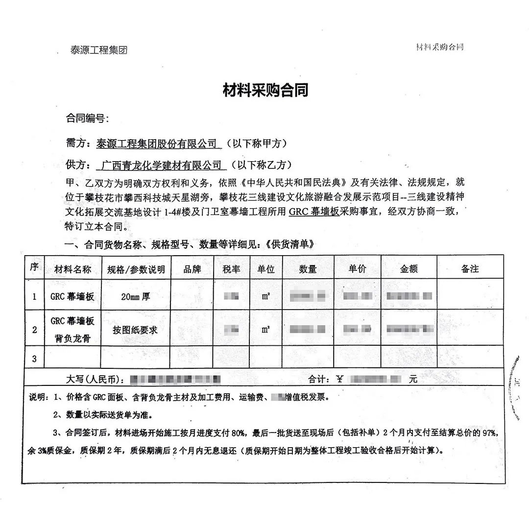 近日,經(jīng)過層層篩選,在與多家實(shí)力雄厚的單位激烈競爭后,青龍公司再次憑借優(yōu)質(zhì)的GRC構(gòu)件、豐富的行業(yè)經(jīng)驗(yàn),雄厚的技術(shù)力量和完善的服務(wù)體系,成功中標(biāo)攀枝花市三線建設(shè)精神文化拓展交流基地GRC幕墻供貨項(xiàng)目,合同金額1400余萬元。
