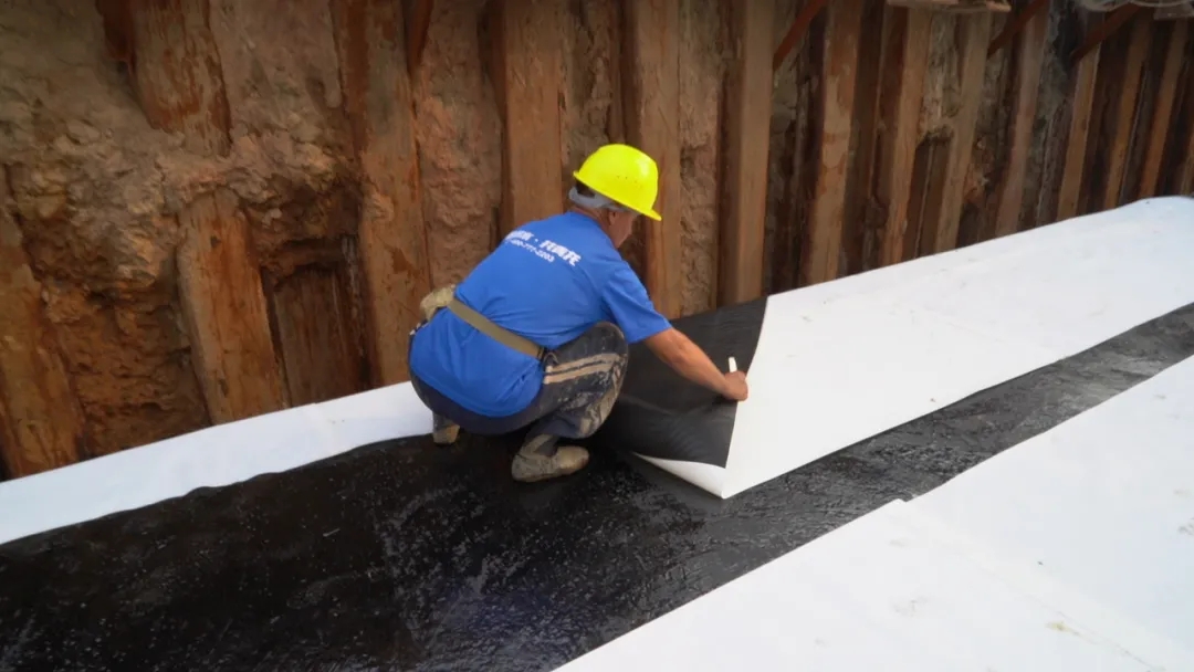 該標(biāo)段防水項(xiàng)目長(zhǎng)度達(dá)到3km,底板防水設(shè)計(jì)的做法是青龍1.2mmHDPE高分子自粘膠膜帶沙粒,管廊的側(cè)墻和頂板所用的防水材料為1.2mmHDPE單面自粘膠膜。目前側(cè)墻的防水施工已經(jīng)全部完成,頂板的防水施工也將在工期內(nèi)很快完成。