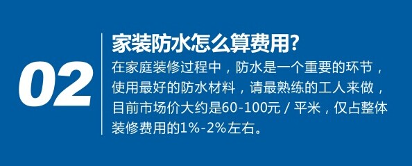 在家庭裝修過程中,防水是一個重要的環(huán)節(jié),使用最適合的防水材料,并請熟練的工人來做是非常重要的。目前市場價大約是60~100元/平米僅占整體裝修費用的1%左右。