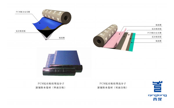 PCM反粘結型自粘聚合物改性瀝青防水卷材有兩種類型,一種是由合成橡膠和樹脂改性瀝青中加入特殊改性劑,聚酯胎為胎體,聚乙烯膜為表面材料或無膜(雙面自粘),采用硅油防粘隔離膜制成的;另一種是由PET聚酯膜(鍍鋁、鋁塑復合)、自粘橡膠瀝青料、硅油防粘隔離膜組成。