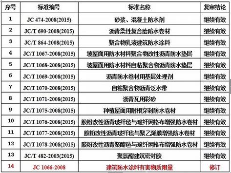 建筑防水行業(yè)中,《砂漿、混凝土防水劑》(JC 474-2008)等13項標(biāo)準(zhǔn)繼續(xù)有效,《建筑防水涂料有害物質(zhì)限量》(JC 1066-2008)1項標(biāo)準(zhǔn)予以修訂。詳情如下: