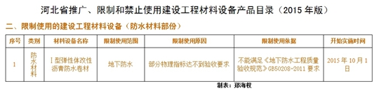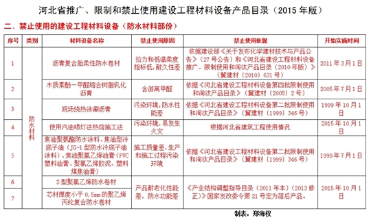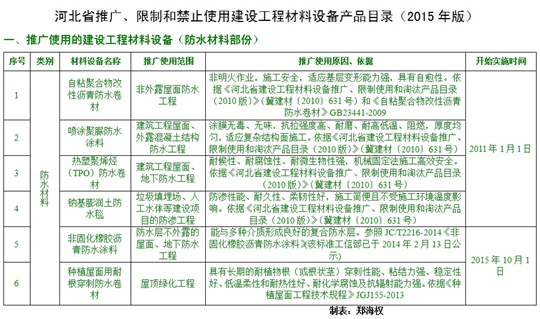 2015年版目錄是前七批“推廣、限制和淘汰使用產(chǎn)品目錄”的綜合更新版。其中,保留了仍需推廣、限制和禁止使用的建材裝備,結(jié)合近幾年河北省工程建設(shè)實際,又增補了新的內(nèi)容。本目錄共涉及182種產(chǎn)品,包括推廣類87種(新列入29種),限制類25 種(新列入12種),禁止類70種(新列入20種),新列入的各類產(chǎn)品,生效時間從2015年10月1日起實施。其中防水材料部份,推廣類6項(新列入2項),限制類1項(新列入1項),禁止類7項(新列入3項)。