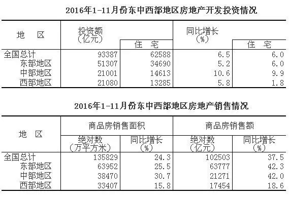 (2)1-11月份,東部地區(qū)房地產(chǎn)開(kāi)發(fā)投資51307億元,同比增長(zhǎng)5.2%,中部地區(qū)投資21001億元,增長(zhǎng)10.6%;西部地區(qū)投資21080億元,增長(zhǎng)5.8%。